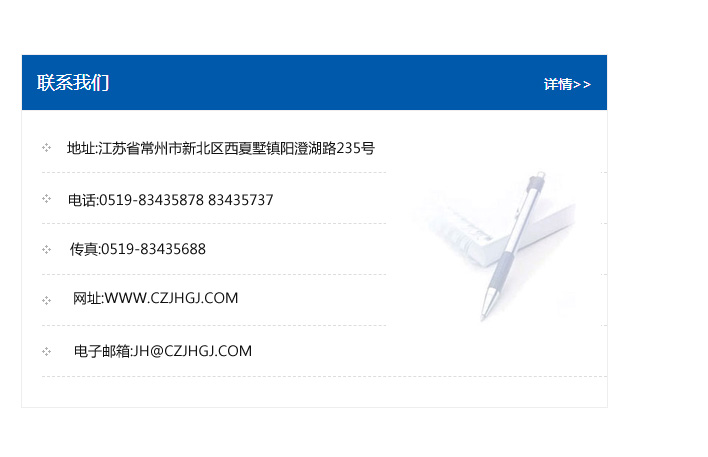 傳真:0519-83435688    郵編:213135    網址:WWW.czjhgj_com.nhtmzy.com    電子郵箱:JH@czjhgj_com.nhtmzy.com